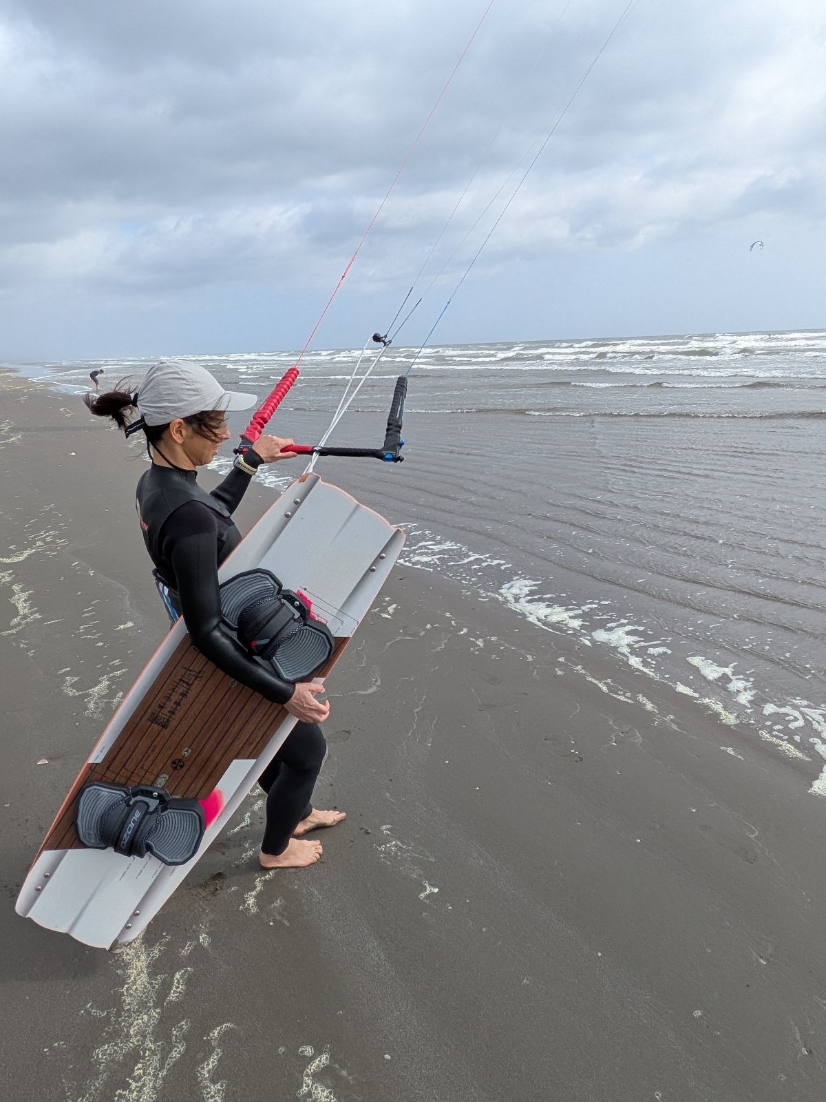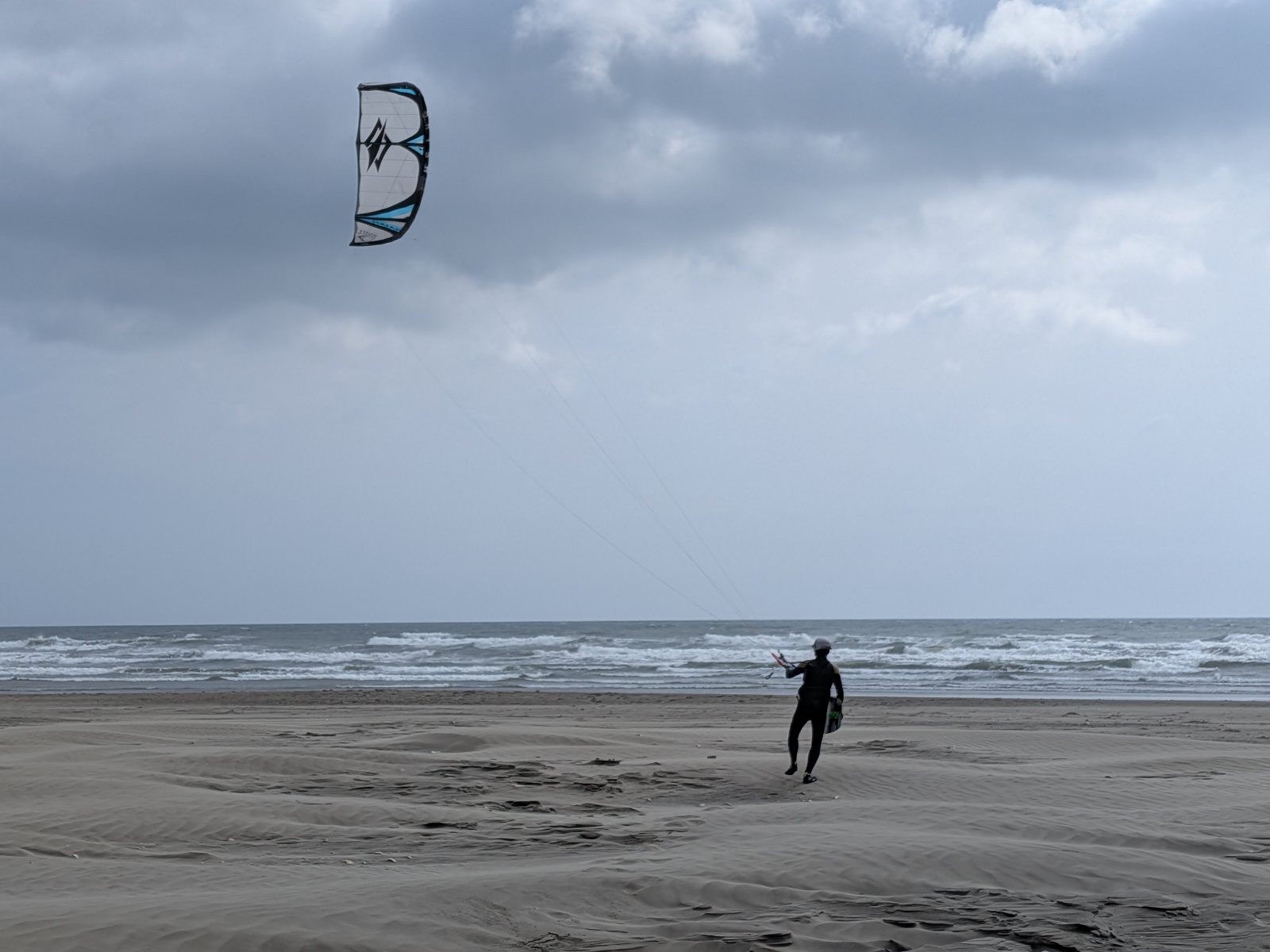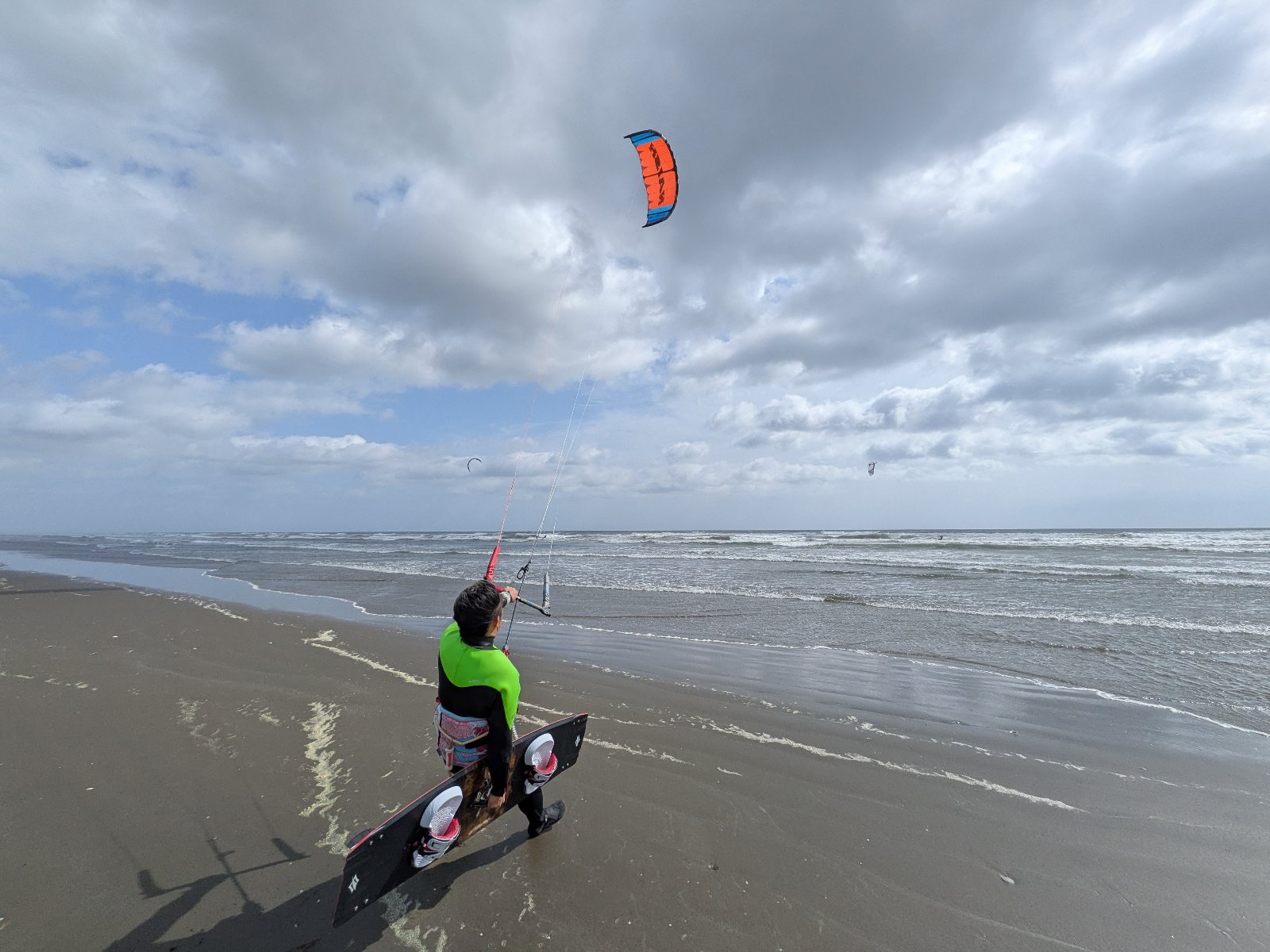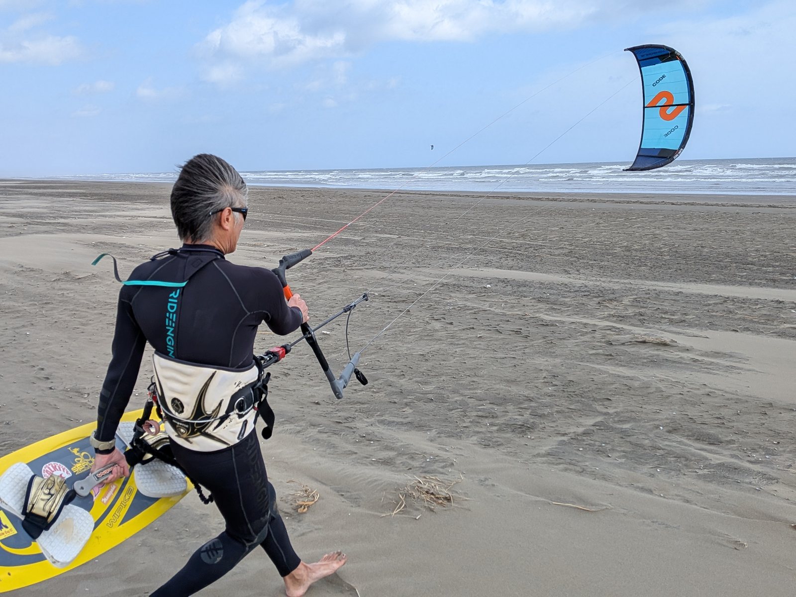 強風の中、一番に今年初カイトのニワさんが7㎡で入水。