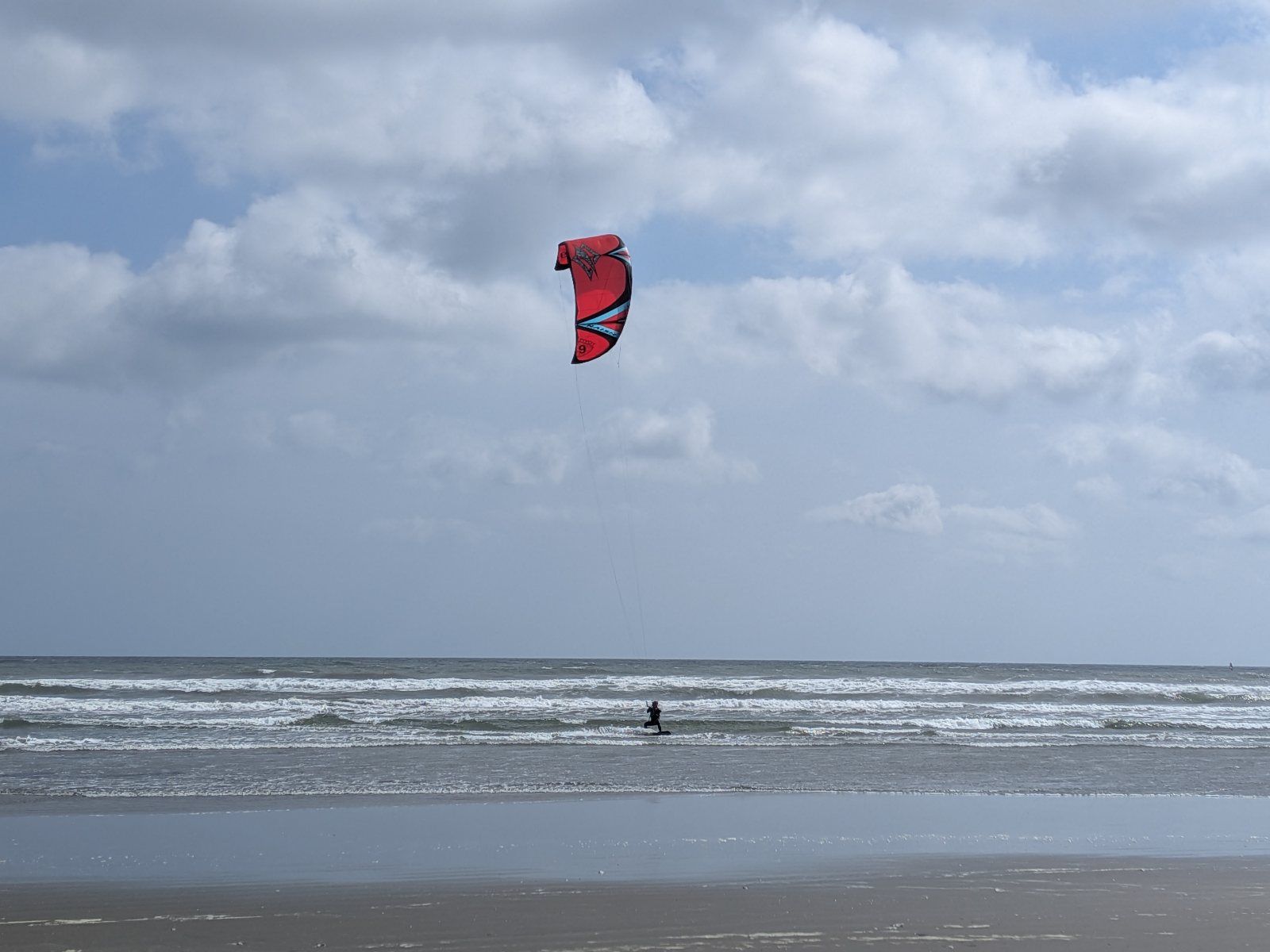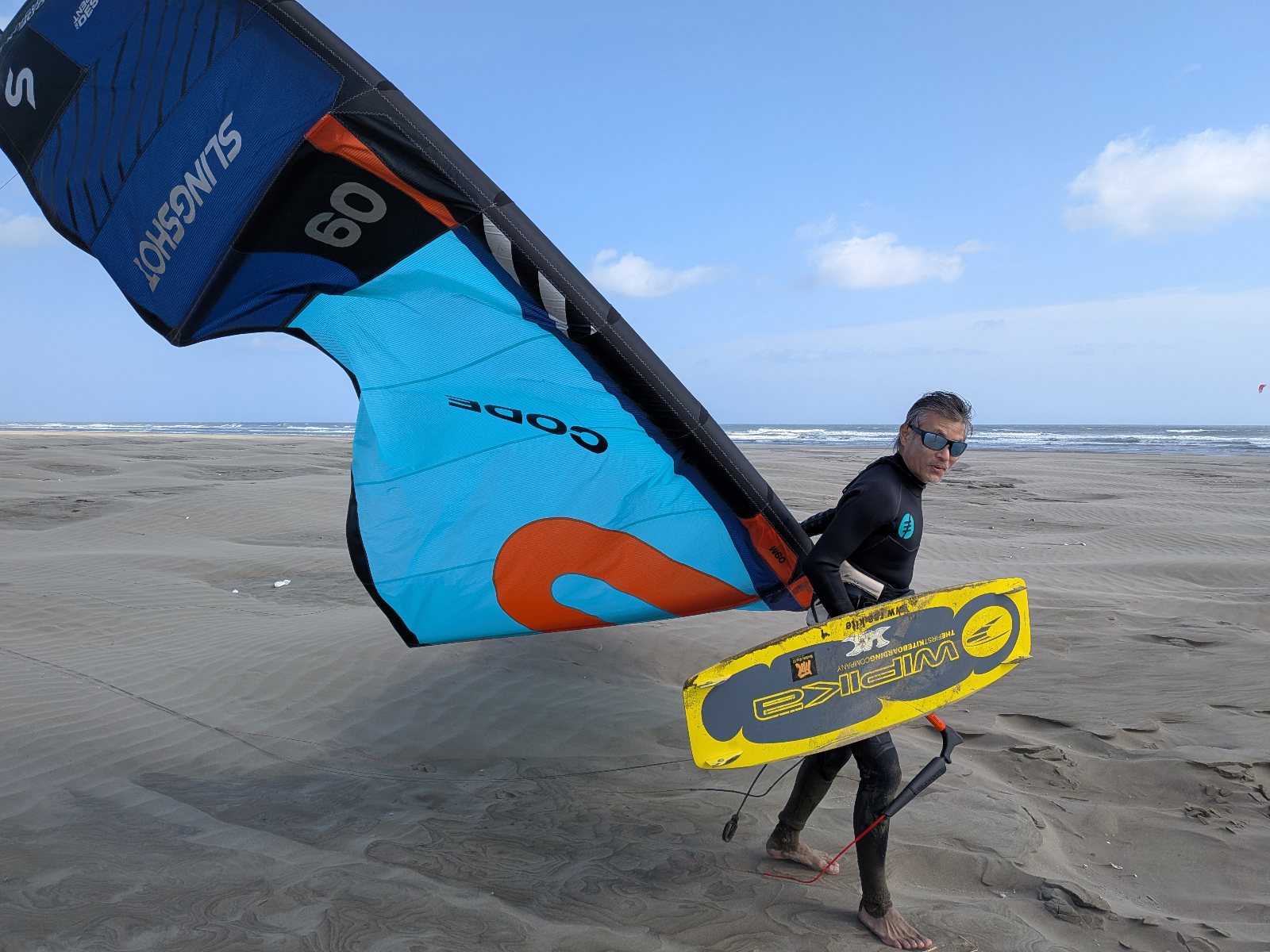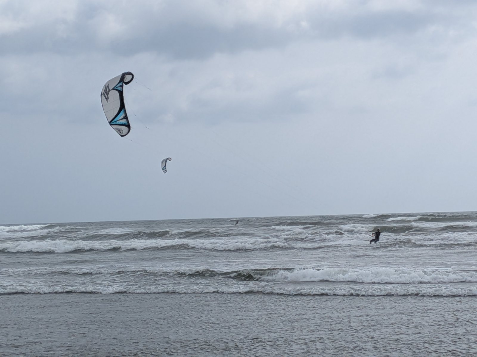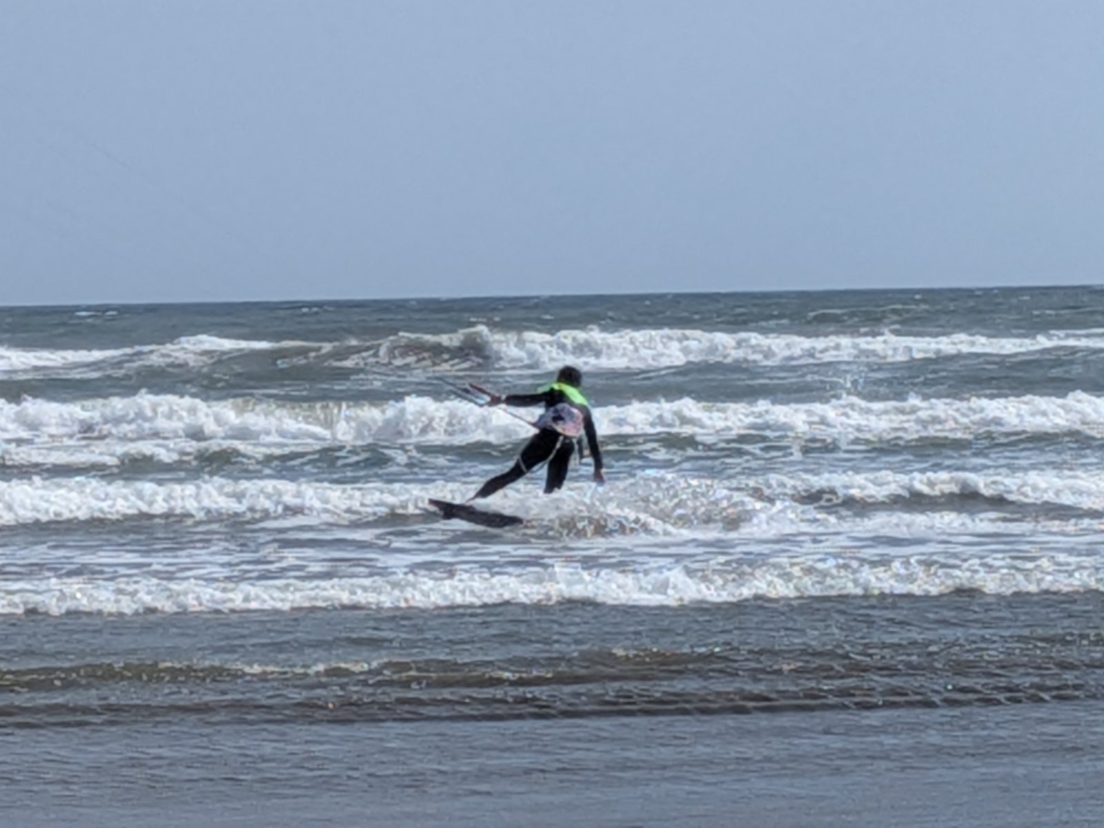 強風の中、一番に今年初カイトのニワさんが7㎡で入水。